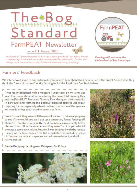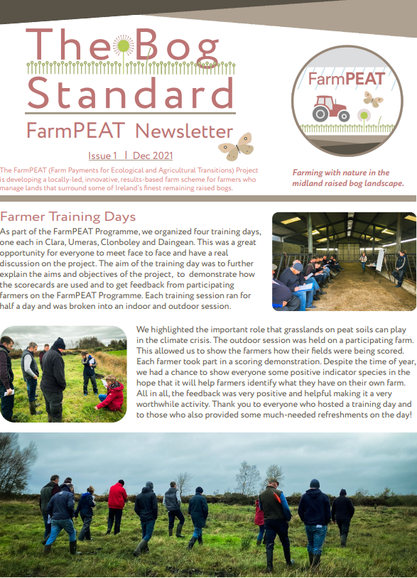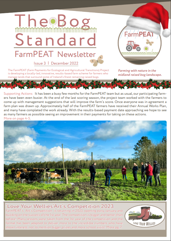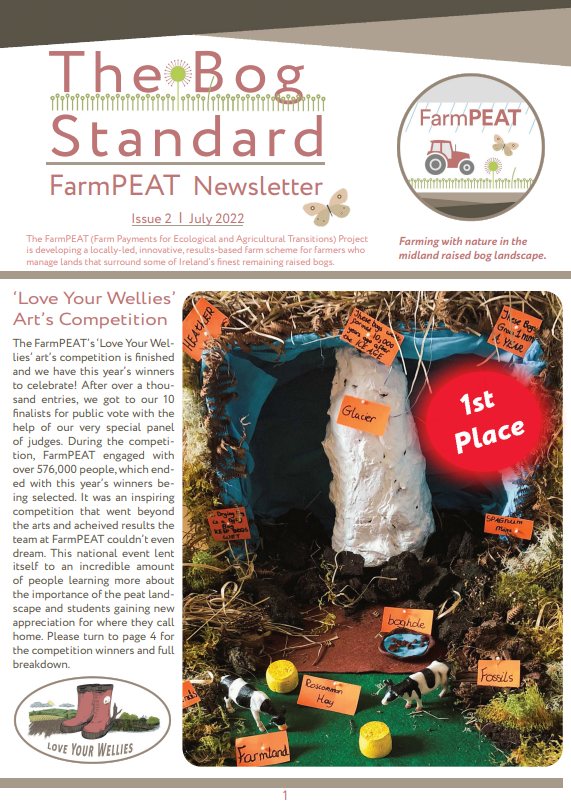 Publications Newsletter: The Bog Standard FarmPEAT Newsletter Issue 1 FarmPEAT Newsletter Issue 2 FarmPEAT Newsletter Issue 3 FarmPEAT Newsletter Issue 4 FarmPEAT Newsletter Issue 5 FarmPEAT Summary Report Project Publications & Videos My Journey Through An EIP FarmPEAT Launch The Community of Clara Bog Dam Installation Training Day Information Leaflet Farmer Training Day Workshop Outputs: 23rd October 2023 Ear to the Ground, FarmPEAT starting at 08:40 FarmPEAT at “4 per 1000” Meeting, starting at 55:55 The Story of Irish Raised Bogs FarmPEAT speaks to Matthijs Schouten Drain Infilling on Agricultural Peat Soils Gnáthóga Nádúrtha Uí Máine Kingdom Project RTÉ Piece about FarmPEAT FarmPEAT Project Overview Story Map: Farmed Peat Soils Press Release - Project LaunchPress Release - Love Your Wellies LaunchPress Release - Farmers Journal Press Releases